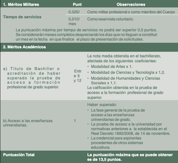 En la fase de concurso se valorarán los méritos militares (tiempo de servicio) y los méritos académicos.